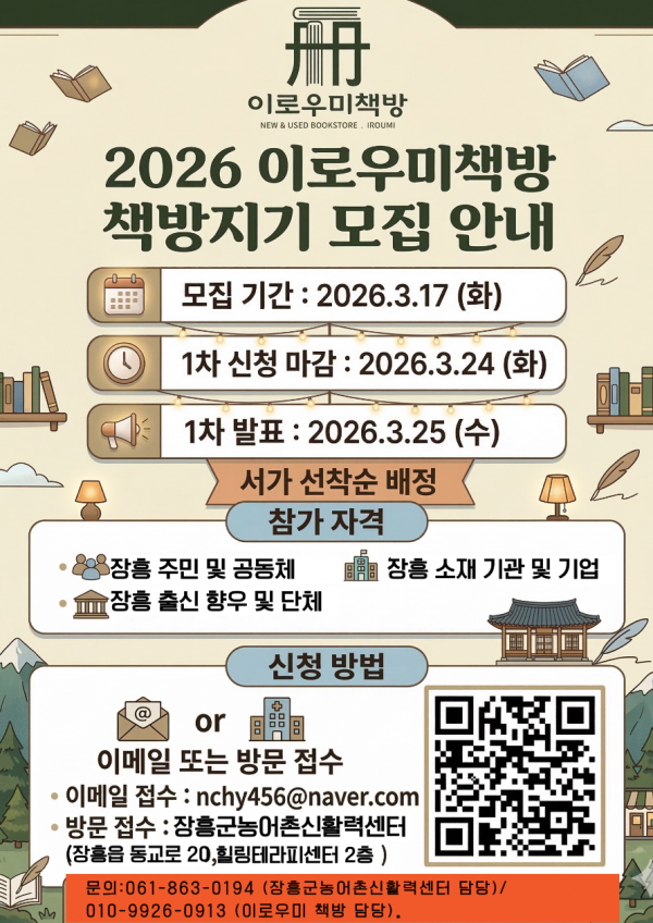 장흥힐링테라피센터 이로우미 책방을 함께 운영할 ‘책방지기’를 모집합니다. 책방지기는 책방의 서가를 임대하여 나만의 서점을 만듭니다. 많은 관심과 적극적인 참여를 바랍니다.자세한 내용은 모집공고문 및 책방지기 신청서를 참조하세요.