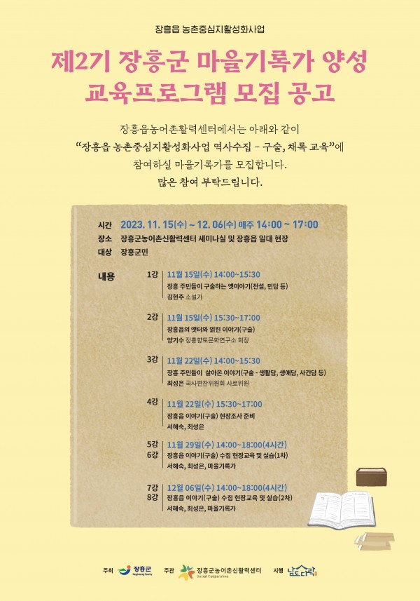 장흥군농어촌신활력센터에서 실시하는 장흥읍농촌중심지활성화사업 중 마을돌봄프로그램‘역사수집-구술, 채록 교육’참여자를 다음과 같이 모집합니다. 2023년 11월 6일 장흥군농어촌신활력센터장 1. 사 업 명: 장…