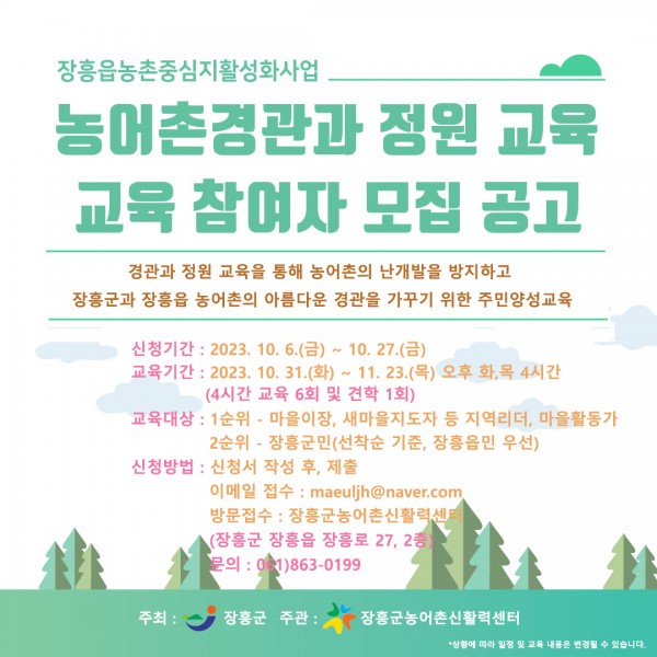 장흥군농어촌신활력센터에서 실시하는 장흥읍농촌중심지활성화사업 중 로컬경제마케팅‘농어촌경관과 정원 교육’참여자를 다음과 같이 모집합니다. 2023년 10월 6일 장흥군농어촌신활력센터장 1. 사 업 명: 장흥읍농촌중심지활성…
