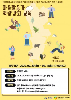 ‘마을활동가’는 장흥군 주민들과 함께 마을을 관찰하고, 마을의 장점을 강화하고 단점은 개선하기 위한 활동을 기획하고 실행하는장흥군의 실천가입니다.2025년 장흥군 마을활동가 양성을 위한 “마을활동가 역량강화 교육”참여자를 다음과 같이 모집합니다.2025년 7월 29일1. 사 업 명: 2025장흥군역량강화사업 지역인적자원네트워크 구축『마을활동가 역량강화 교육』2. 신청기간: 2025 7. 29.(화) ∼ 8. 12.(화) 17:00까지 (2주간)3. 신청대상: 장흥군민 누구나이런 분들에게 추천합니다!- 마을에서 뭔가 해보고 싶은데 어…