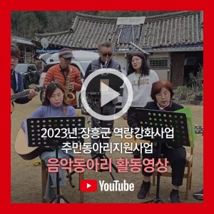 2023 장흥군역량강화사업(농림부)의 지원을 받아 활동한 주민동아리 활동영상입니다.음악동아리 7개소, 일반동아리 7개소의 장흥군 동아리들의 활발한 활동을 엿볼 수 있습니다.영상은 교육을 통해 양성된 주민전문가에 의해 완성되었습니다.2023 장흥군역량강화사업(농림부) 주민동아리지원사업 - 일반동아리 활동영상 (youtube.com)2023 장흥군역량강화사업(농림부) 주민동아리지원사업 - 음악동아리 활동영상 (youtube.com)